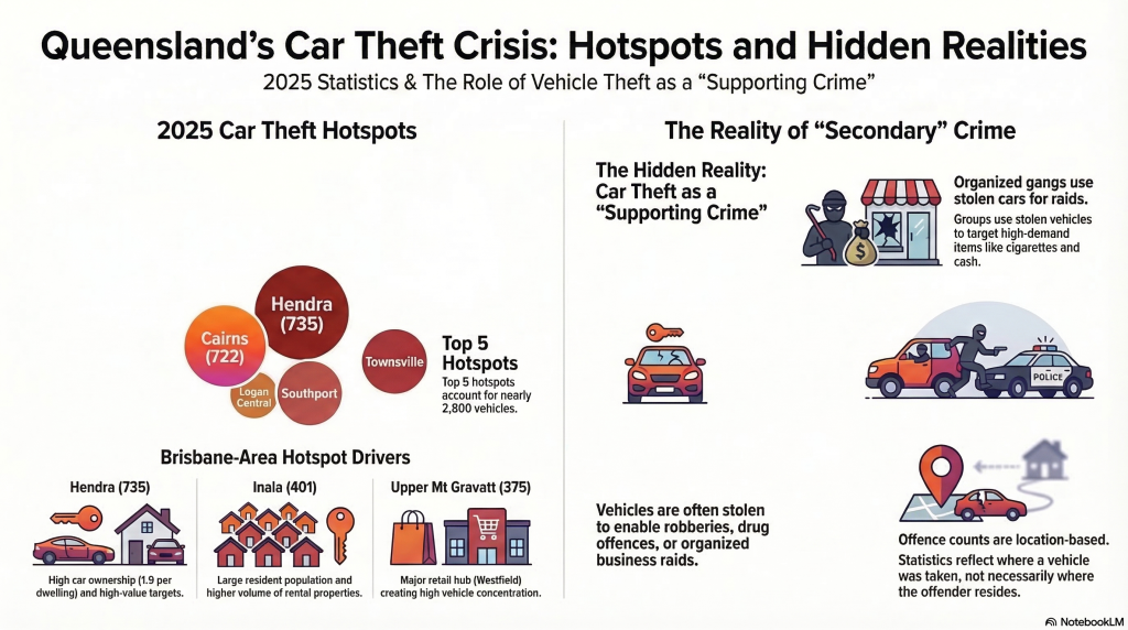 Vehicle theft figures are recorded based on where the offence occurs, meaning suburbs with large numbers of parked vehicles or commercial areas can record higher totals even if many offenders live elsewhere.